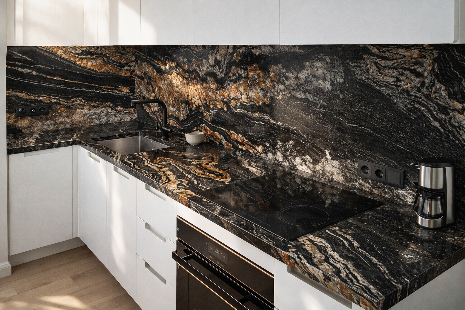 Столешница и фартук для кухни, из гранита Блэк Фьюжен
