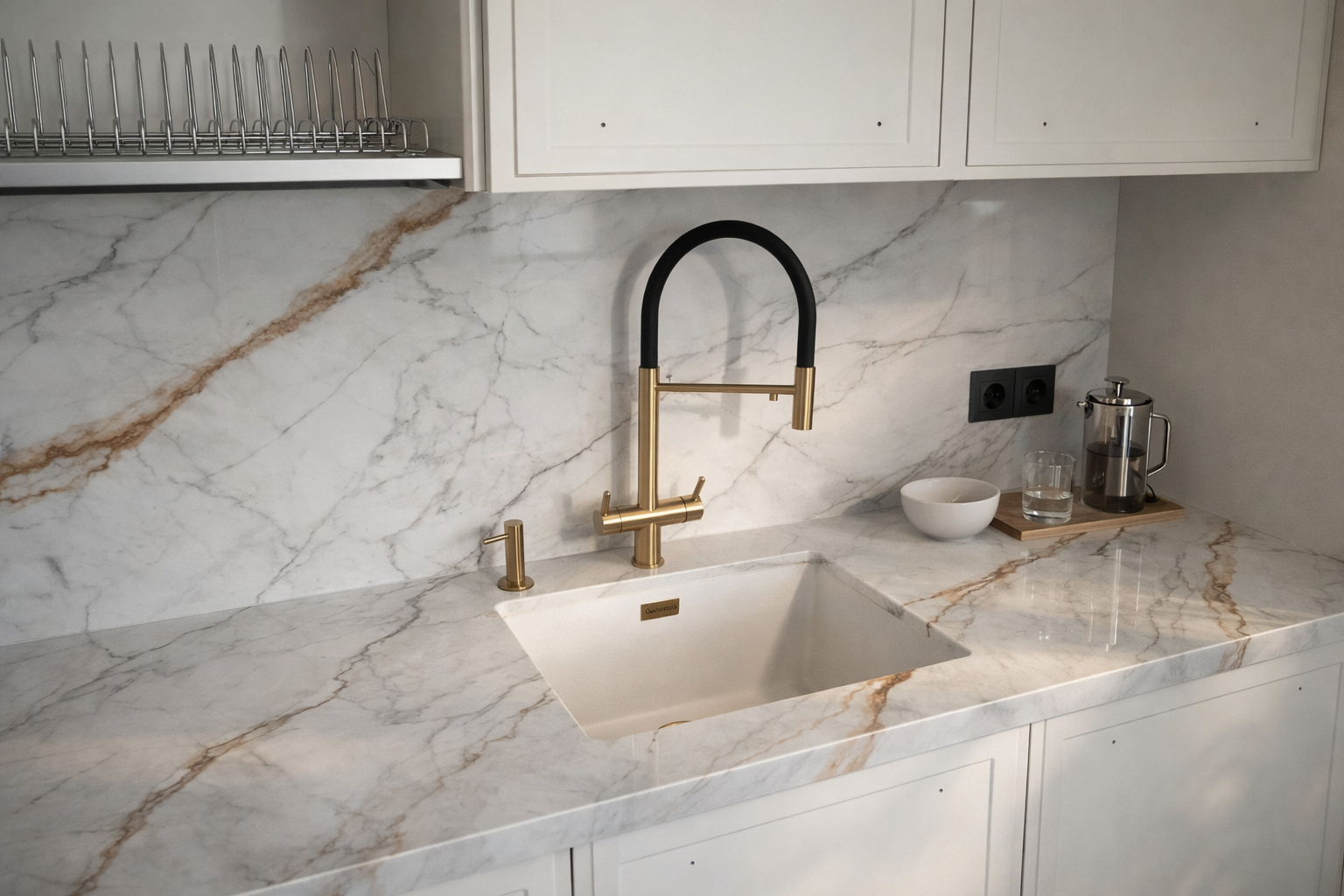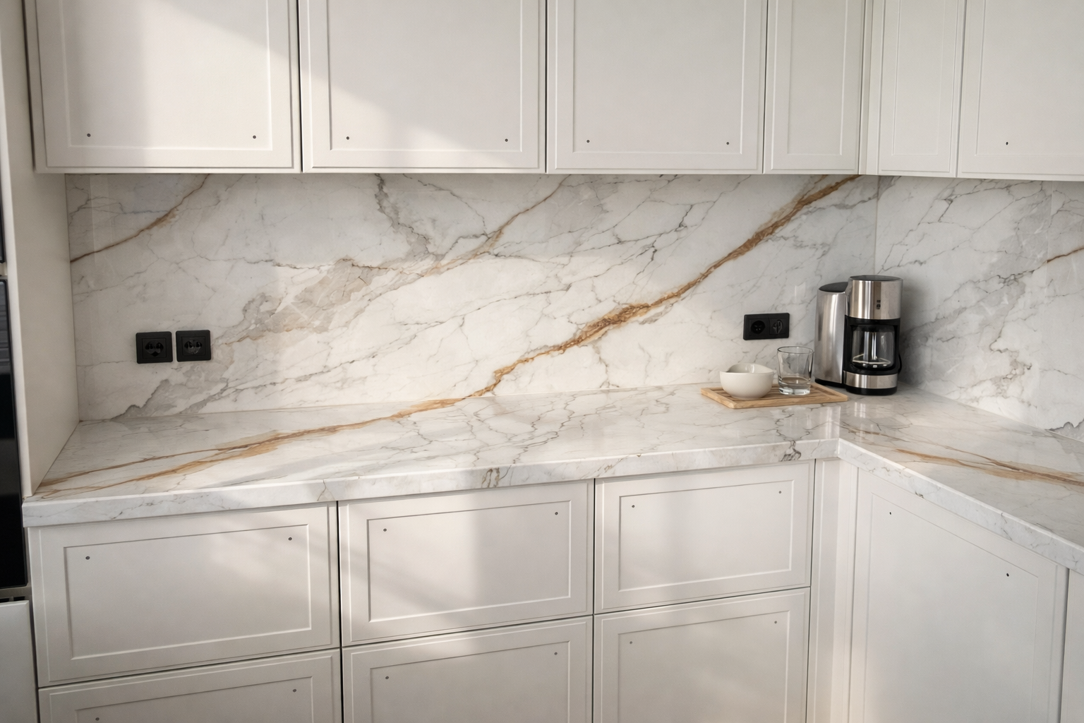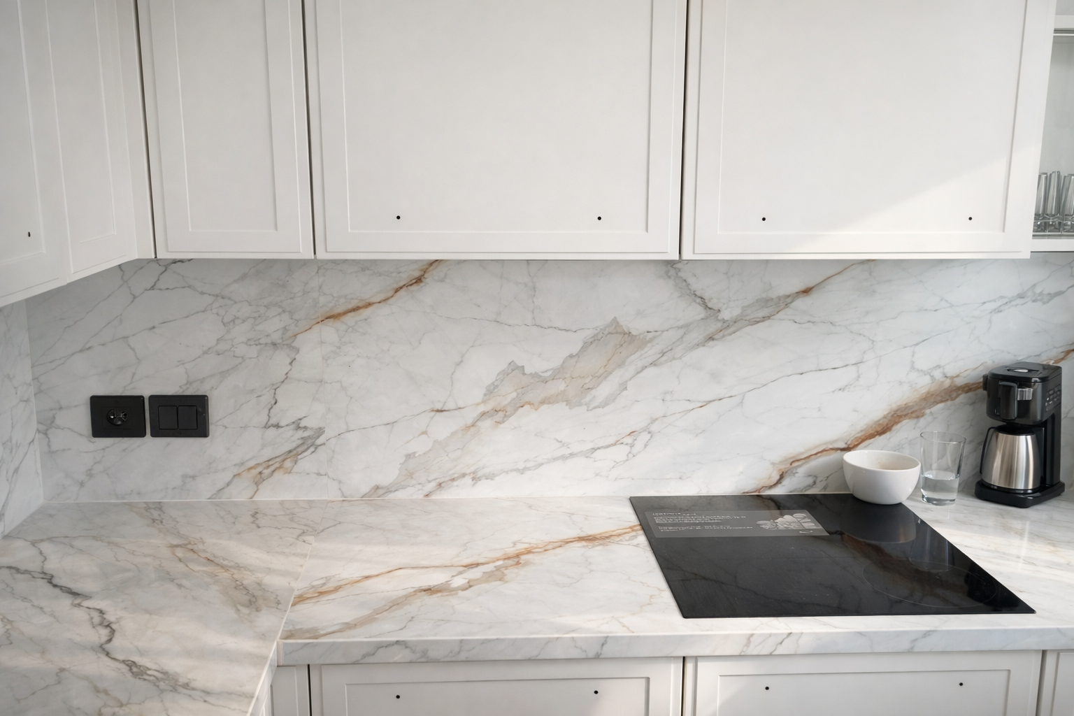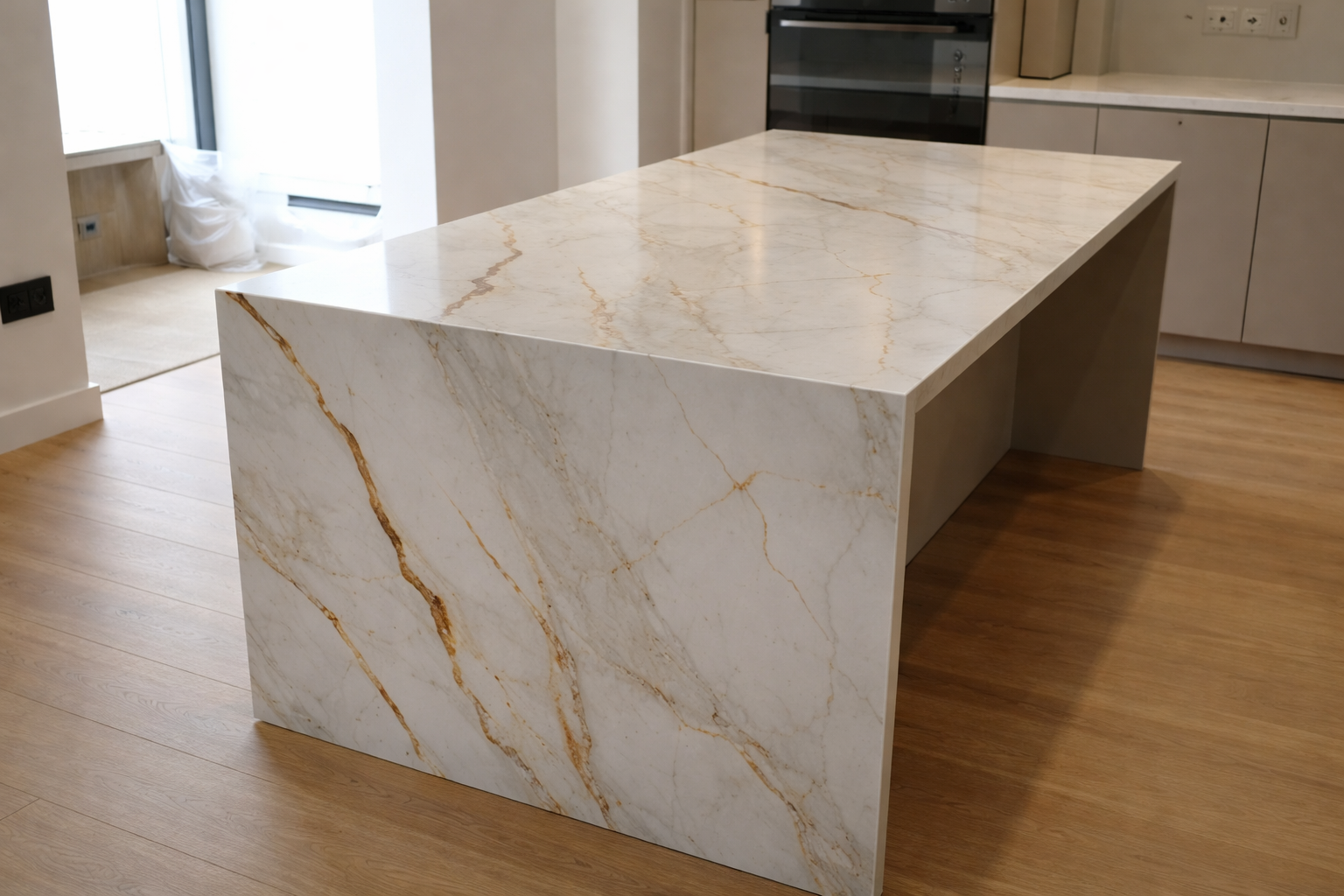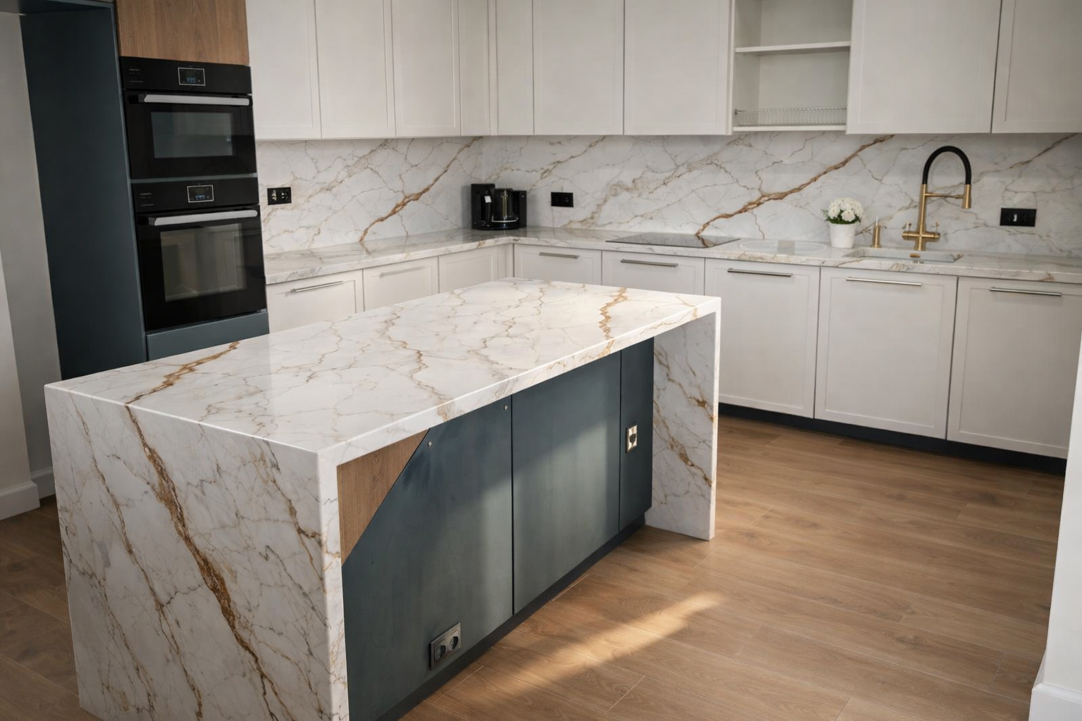 Столешница и фартук для кухни, с островом с ногой, из кварцевого агломерата Avant Quartz Калакатта Бессон 5751