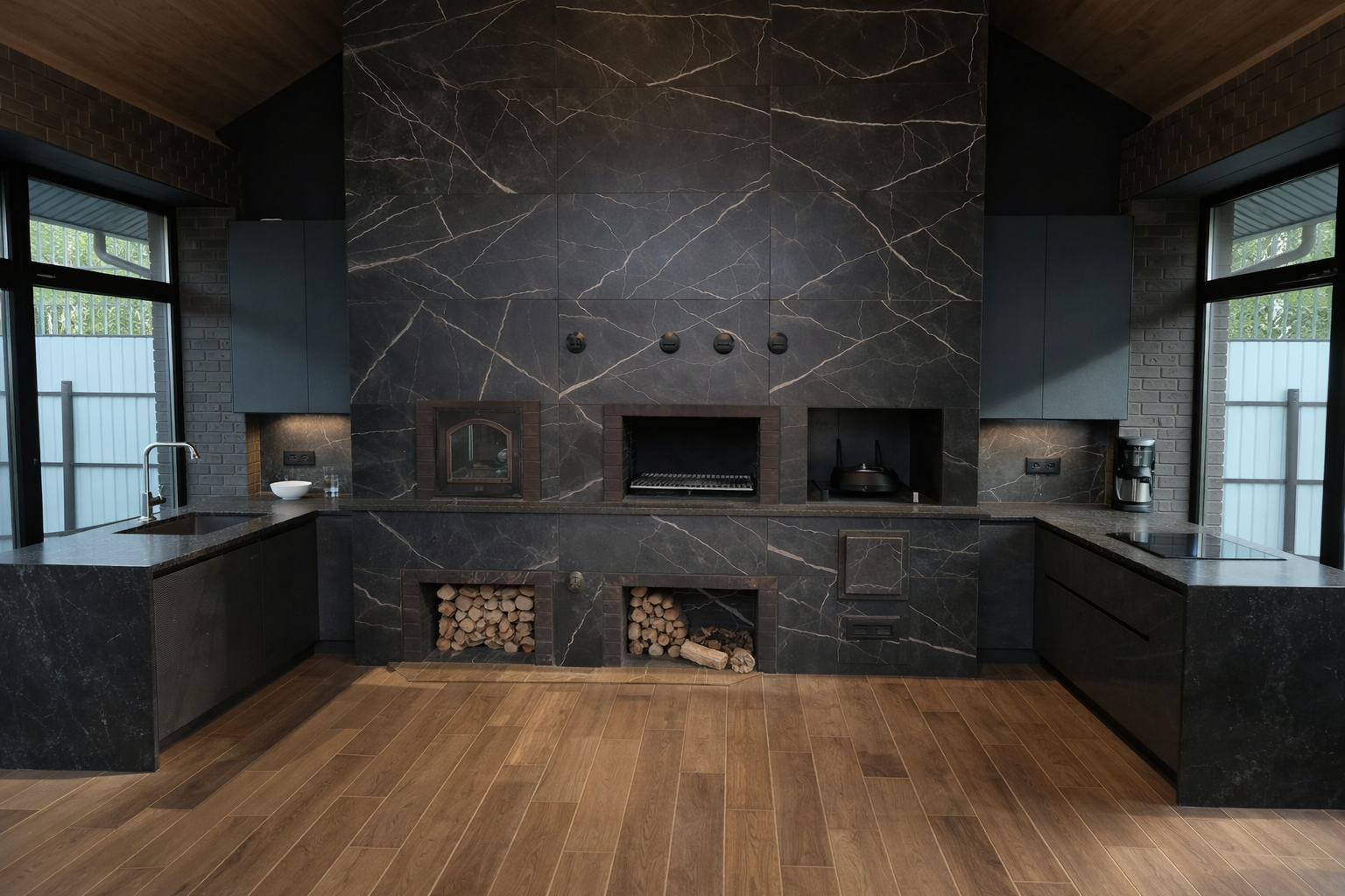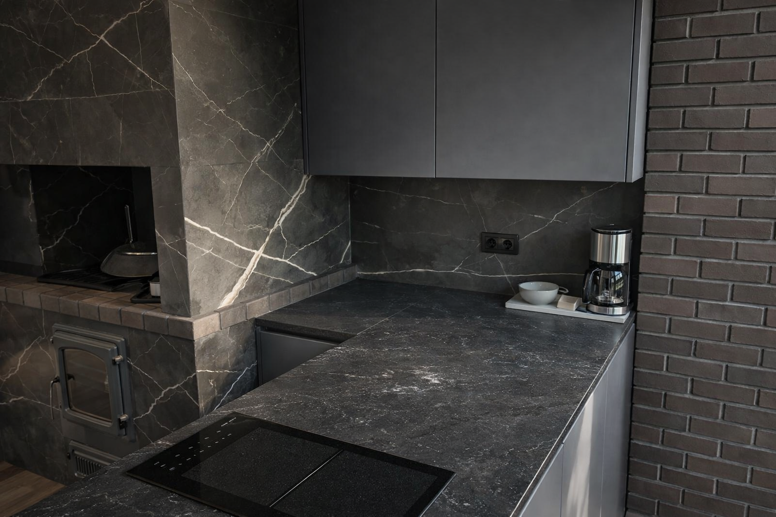 Столешница для кухни, с островом, из кварцевого агломерата Etna Quartz Black Perlino EQPM 028