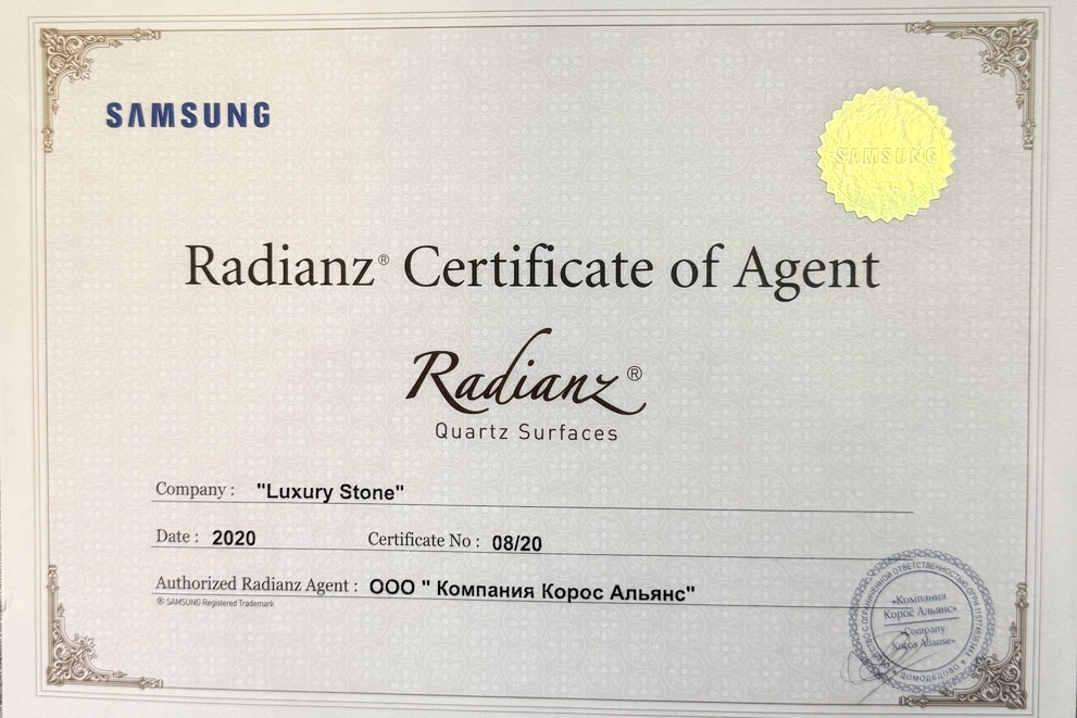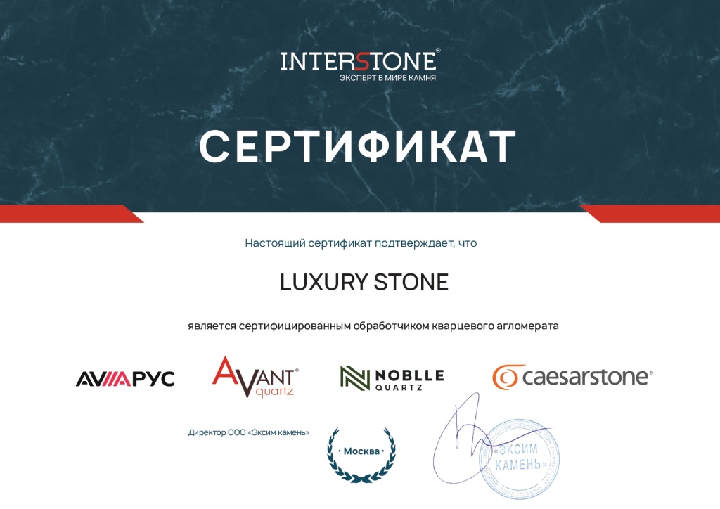 Мы — сертифицированные обработчики. Кроме того, наши специалисты являются сертифицированными специалистами: они успешно прошли подготовку и сертификацию у производителей камня, а наше оборудование соответствует высоким стандартам точности и современности. Производственные процессы соответствуют требованиям государственных стандартов (ГОСТ) и специализированных регламентов по работе с камнем. Всё это гарантирует безупречную резку, обработку и монтаж, продлевая срок эксплуатации наших изделий.